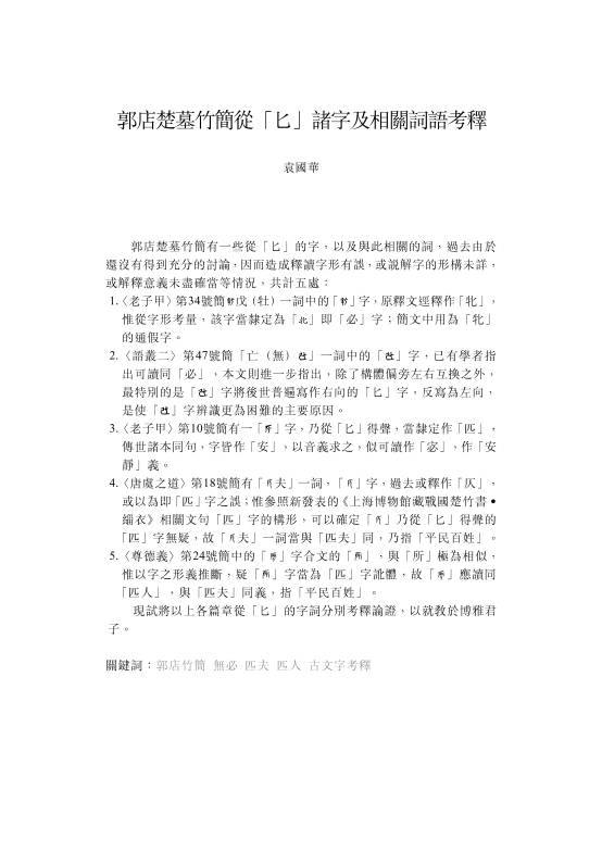 of Some Guodian Bamboo Slips Characters which Comprise the Radical of bi, and